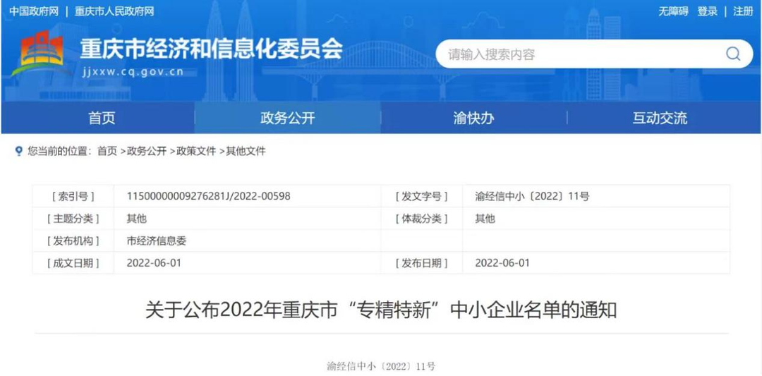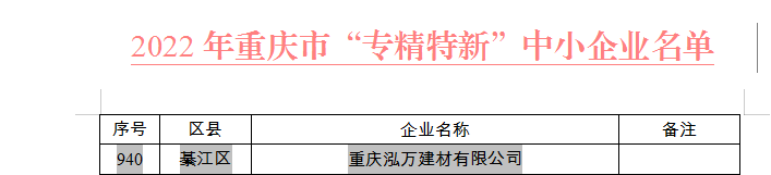 2022年6月1日,重慶市經(jīng)濟(jì)和信息化委員會(huì)公布了2022年重慶市“專精特新”中小企業(yè)名單。重慶泓萬建材有限公司榮獲“專精特新”企業(yè)稱號(hào)!